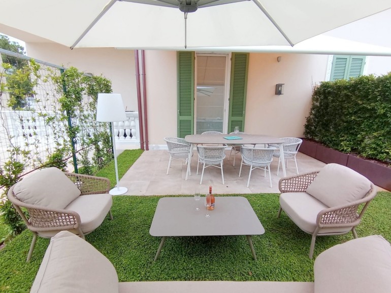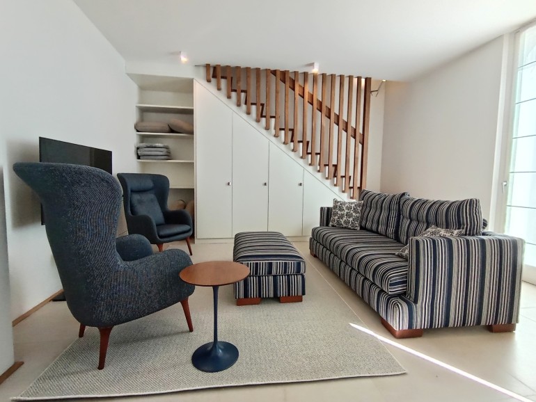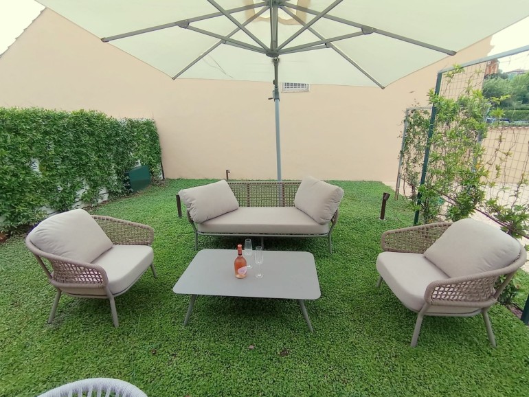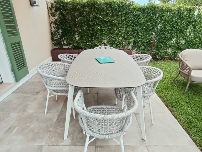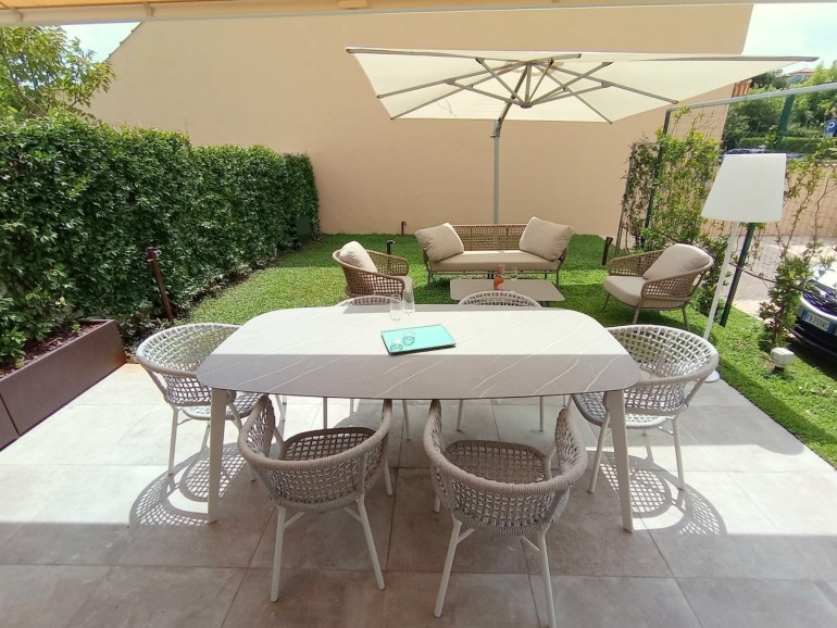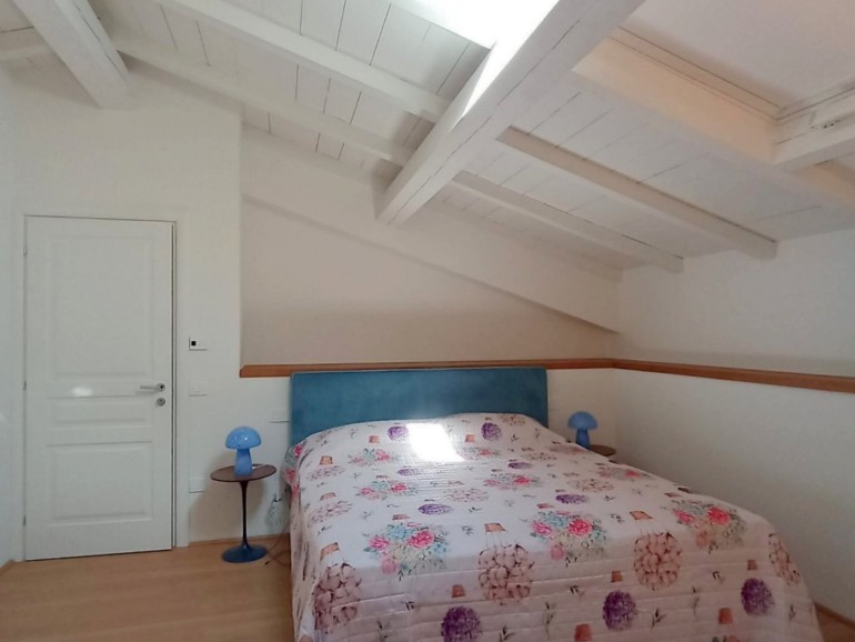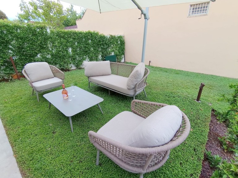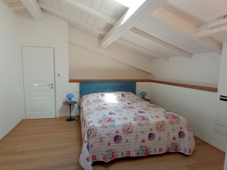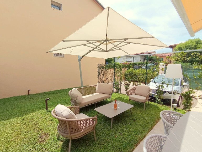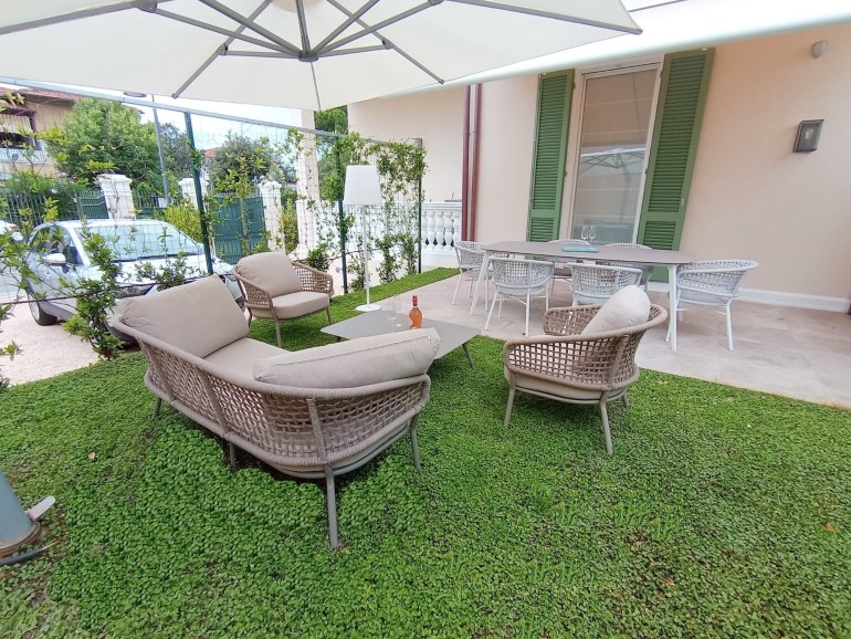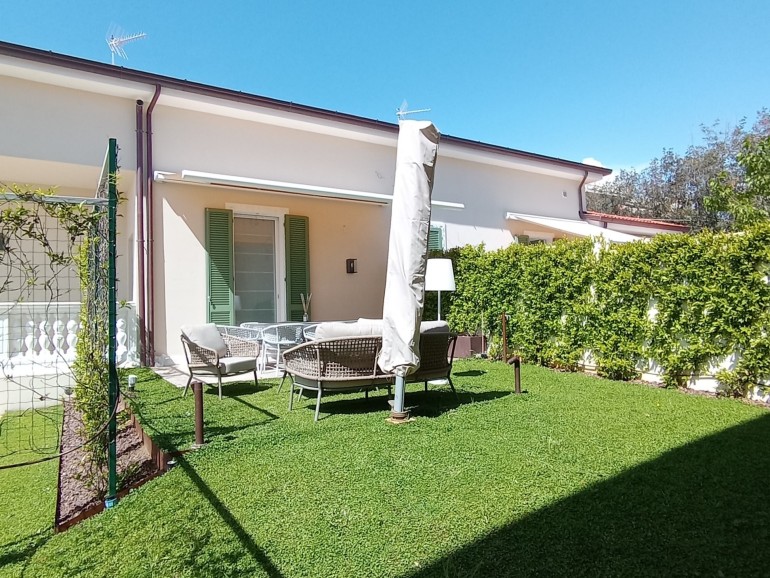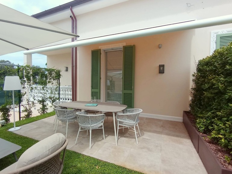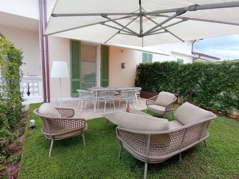Marina di Pietrasanta - 4/6 posti letto - A 90 mt dal viale a mare, nuovo ed elegante villino in bifamiliare elevato su due livelli fuori terra. L'unità, finemente ristrutturata, si compone al piano terra di : porticato, ingresso-soggiorno con cucina abitabile in soluzione open space, antibagno, 1 servizio, disimpegno, bagno con doccia, camera matrimoniale. Piano primo : disimpegno, camera matrimoniale con changing room privata, bagno con doccia, vano multiuso attrezzato, vano tecnico con lavatrice, lavabo ed asciugatrice. La proprietà è inoltre corredata di zona esterna pavimentata attrezzata per il pranzo, giardino e n. 2 posti auto.Travi a vista. Parquet. Aria condizionata.Impianto di allarme. Pannelli fotovoltaici con contatore potenza 6 kw. Riciclo forzato dell'aria. Cancello pedonale e cancello carrabile automatico. Disponibile stagione estiva. CIN IT046024C2S7UZICON