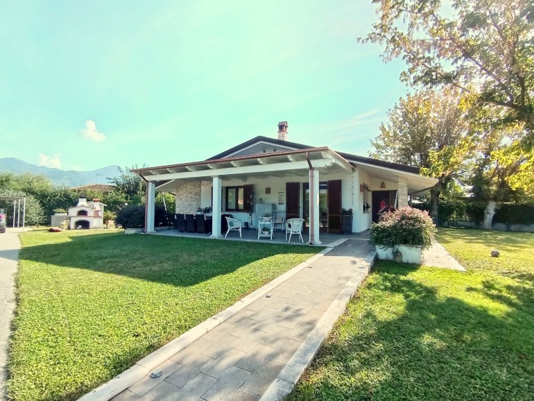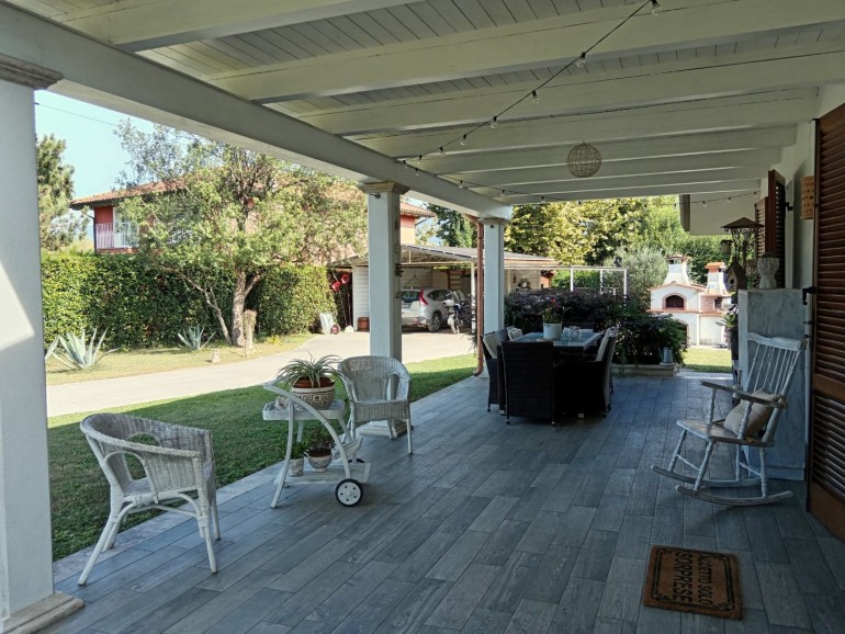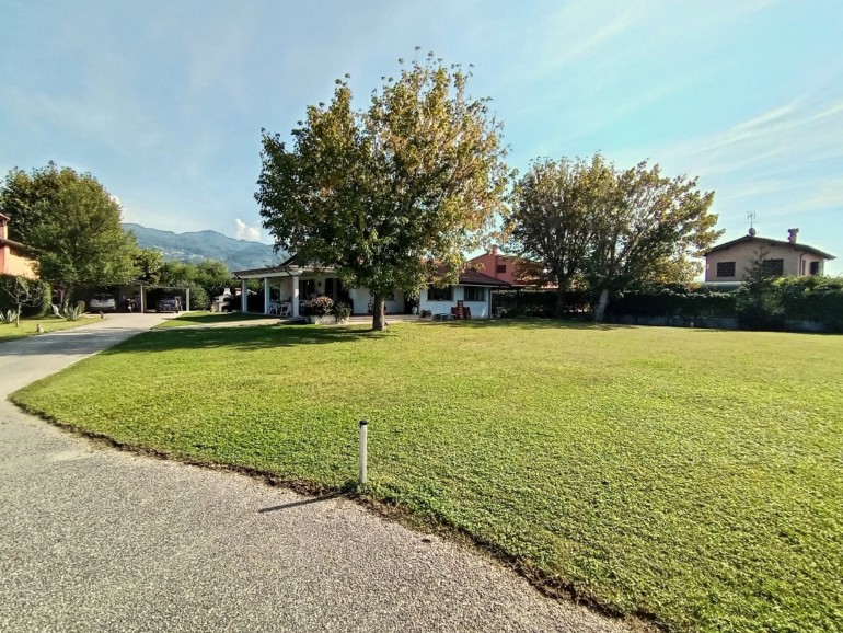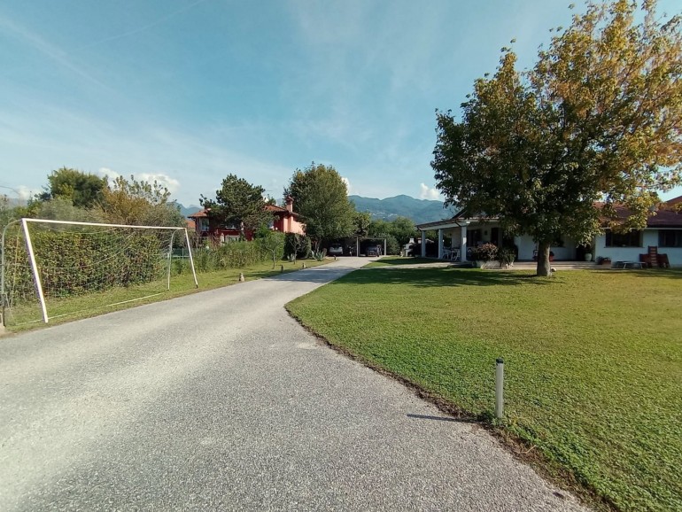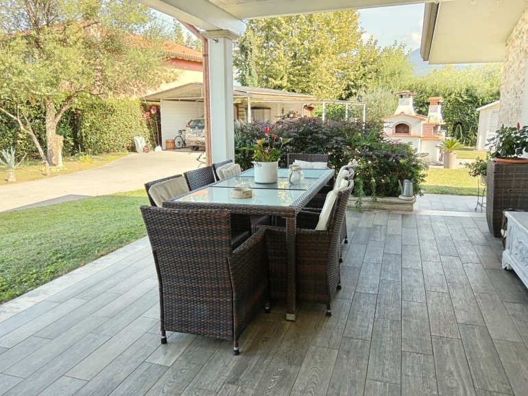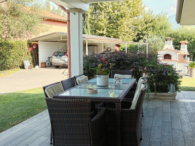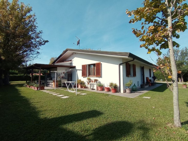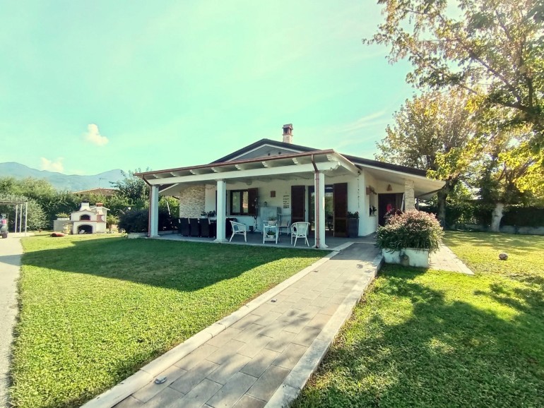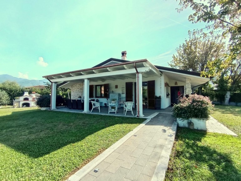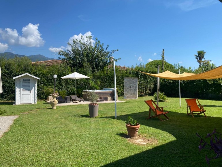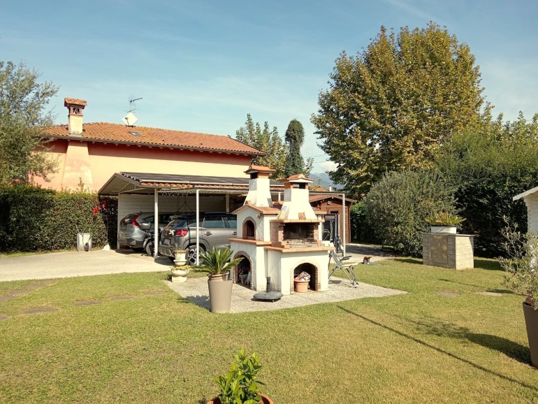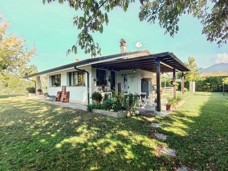Pietrasanta adiacenze Marina - A circa 1600 mt dal mare, su lotto di circa mq 1000, unità immobiliare monofamiliare elevato al solo piano terra per circa mq 120 composta da : ampia veranda/pergola sul fronte, ingresso, soggiorno- pranzo open con accesso al giardino, cucina con luminoso vano pranzo ed accesso a veranda/pergola sul retro, corridoio, 1 camera piazza e mezzo con bagno doccia privato, 1 camerina/ripostiglio, 1 ampio bagno con vasca, 1 camera matrimoniale. Unità corredata di tettoia adibita a posto auto.Riscaldamento a pavimento.Impianto fotovoltaico.Cappotto termico. Irrigazione automatica con pozzo. Nella proposta di vendita è compreso un lotto di terreno agricolo di circa 600 mt collocato di fronte all'unità.