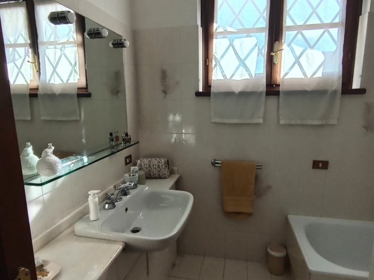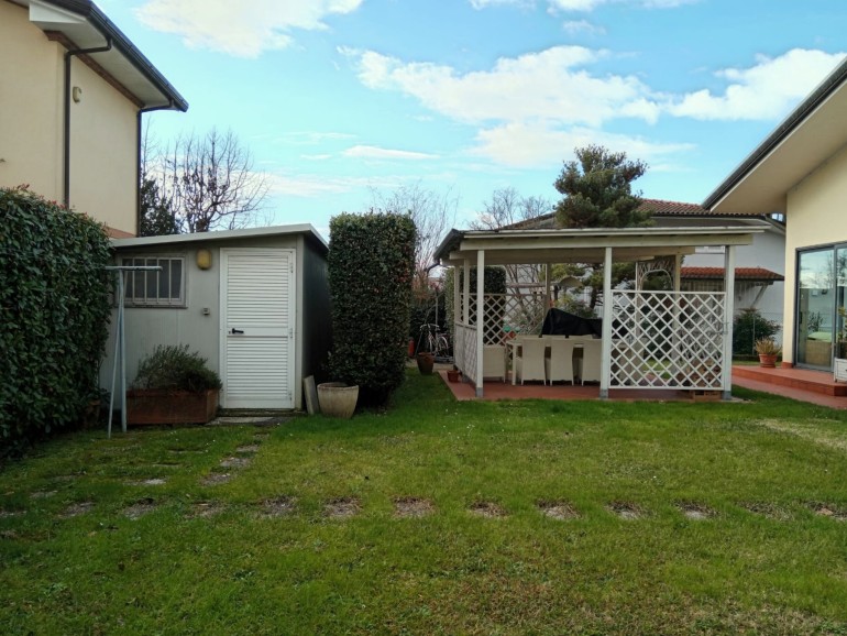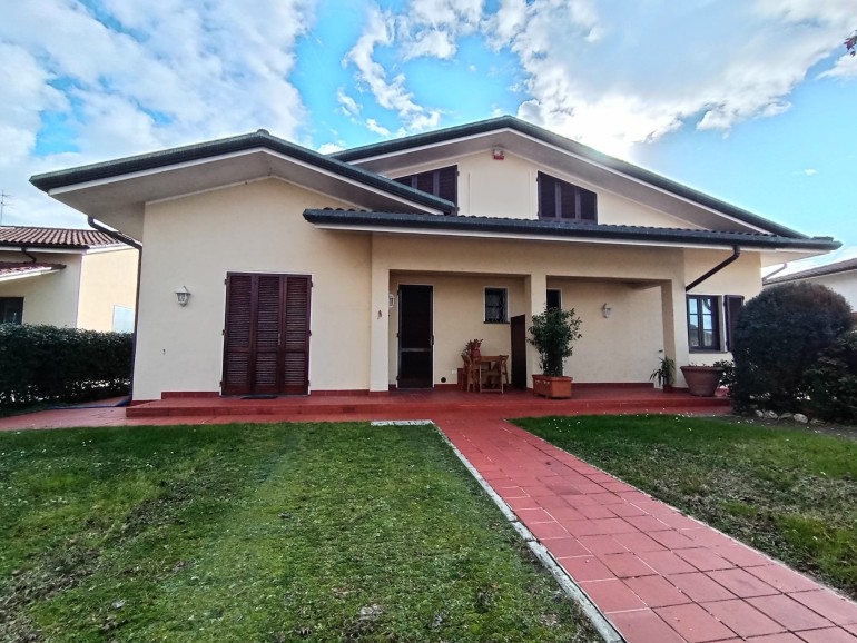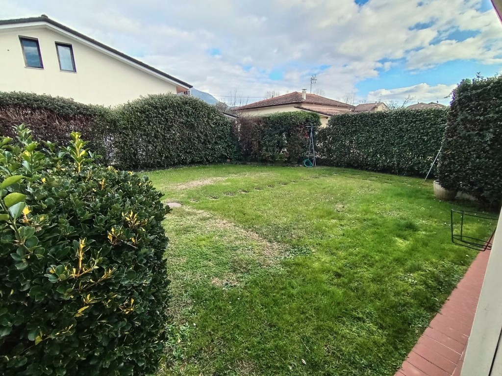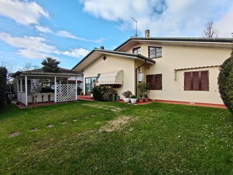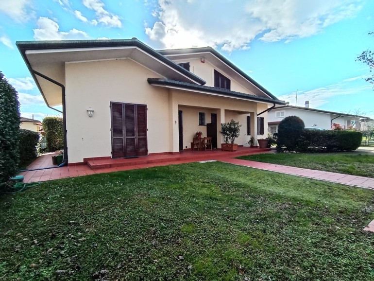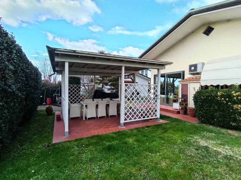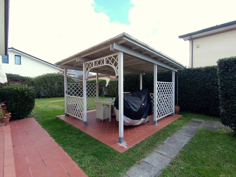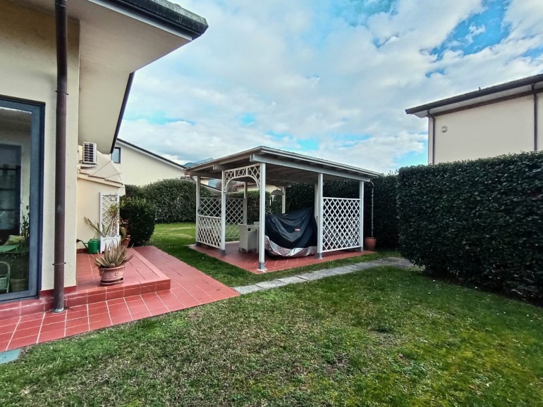 Pietrasanta - Nelle vicinanze del centro storico della città d'arte e di facile accesso alla Marina, villa in bifamiliare elevata su due livelli fuori terra per totali mq 155. L'unità, in ottime condizioni manutentive, corredata di cancello pedonale e cancello carrabile, è composta al piano terra da : piccolo porticato, ingresso-soggiorno-pranzo con scala in legno a vista, disimpegno,luminosa cucina abitabile con porticato adatto a momenti di relax, bagno con doccia, ripostiglio. Piano primo : due camere matrimoniali, 1 camera da una piazza e mezzo, un bagno con vasca, un servizio. Resede/giardino esclusivi su tre lati. Gazebo sul retro fronte porticato. Locale tecnico. Ripostiglio distaccato dalla unità. Posti auto. Aria condizionata.