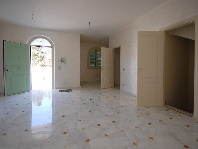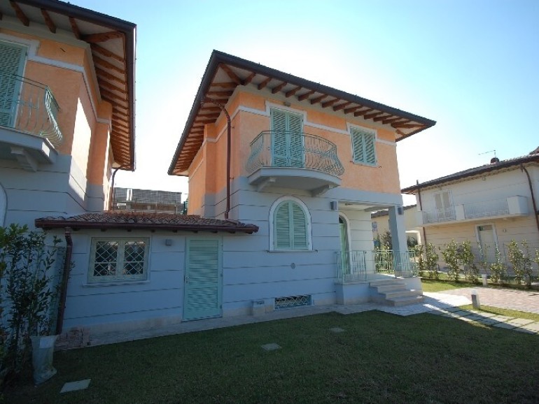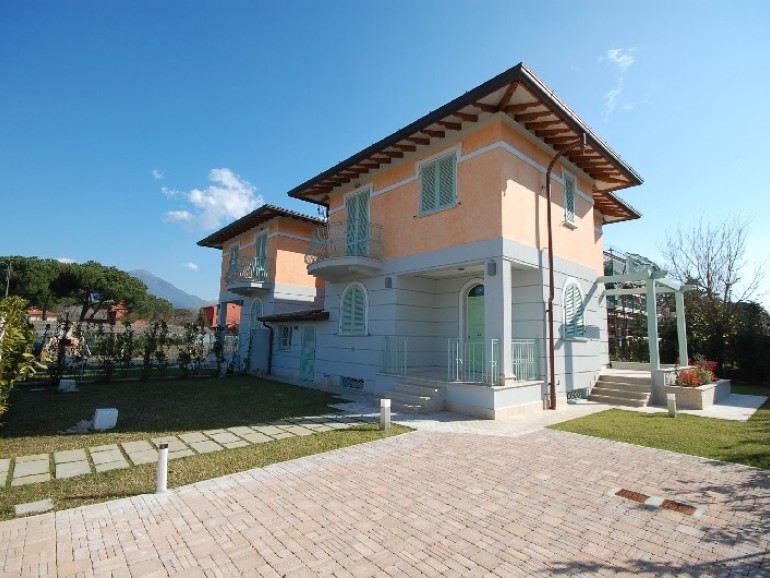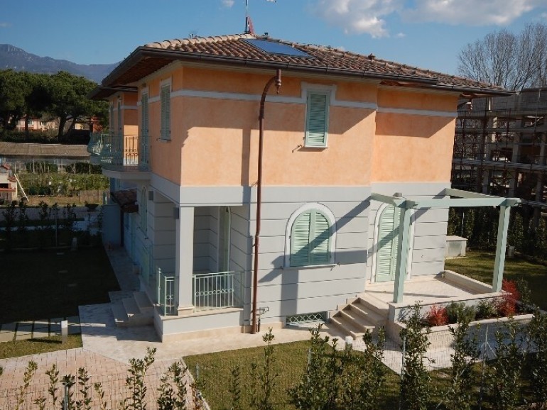 Marina di Pietrasanta - Su lotto di mq 378, elegante villino in bifamiliare costruito nell'anno 2020, elevato su due livelli fuori terra oltre a piano seminterrato. L'unità di mq Lordi 194,27 Lordi collegata alla villetta gemella soltanto dall'annesso sul lato monte, è composta al piano terra rialzato da : porticato d'ingresso,ingresso, luminoso soggiorno-pranzo di mq 40 con accesso ad altro porticato, angolo cottura con finestra. Rimessa di mq 16,30 con accesso indipendente.Piano primo : disimpegno,due camere entrambe con terrazzo privato, una altra camera, bagno con doccia. Piano seminterrato : vano primario di mq 25, piccola cantina,altri tre vani utili di cui un bagno ed una lavanderia. Piano soffitta.. Ottime finiture Marmo e travertino. Predisposizione condizionamento.Impianto di allarme. Irrigazione automatica.Riscaldamento a pavimento.Pannelli solari per produzione acqua calda. Possibilità di realizzazione piscina come da render con immagine dal valore puramente estetico e non vincolante.